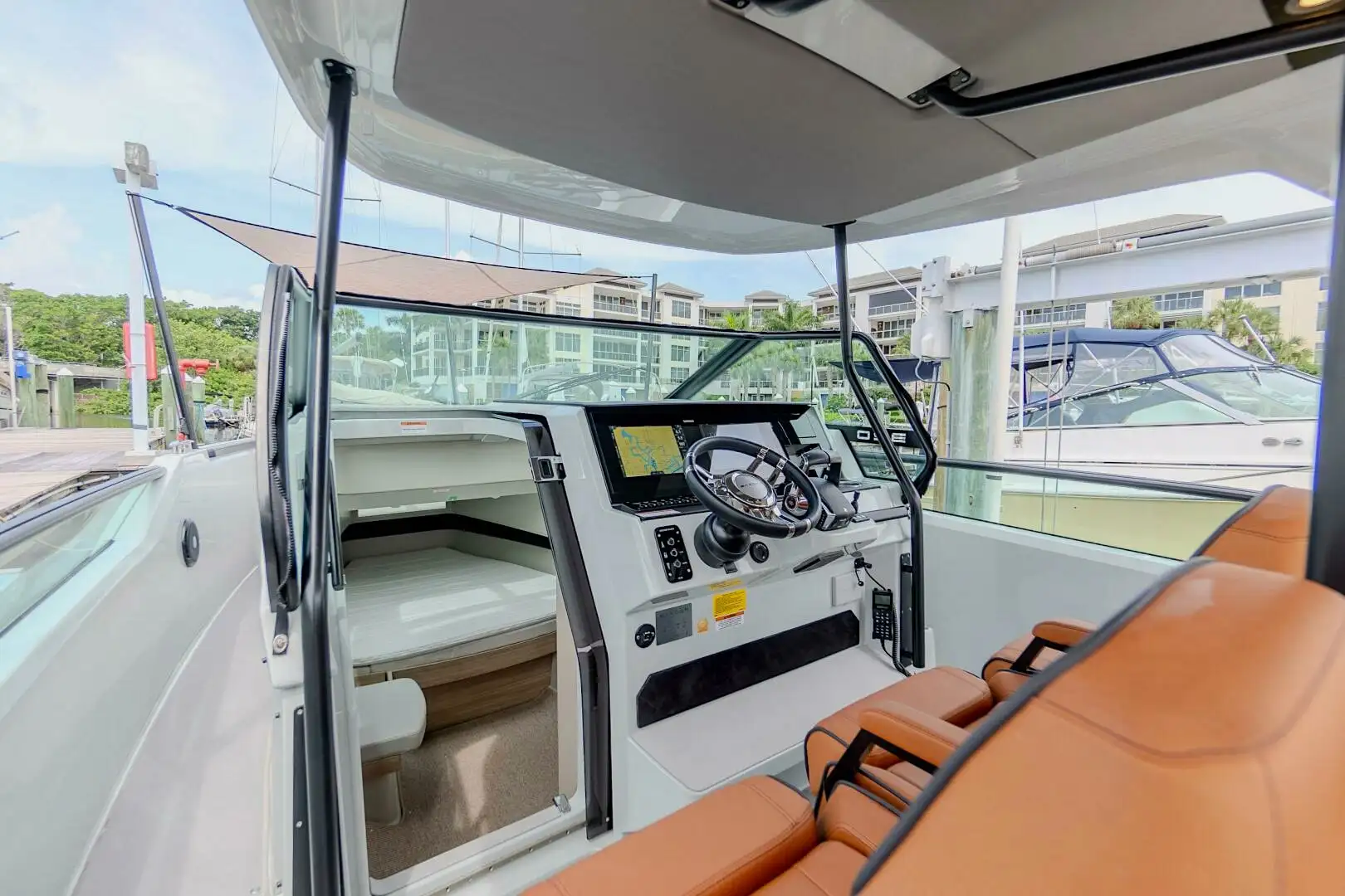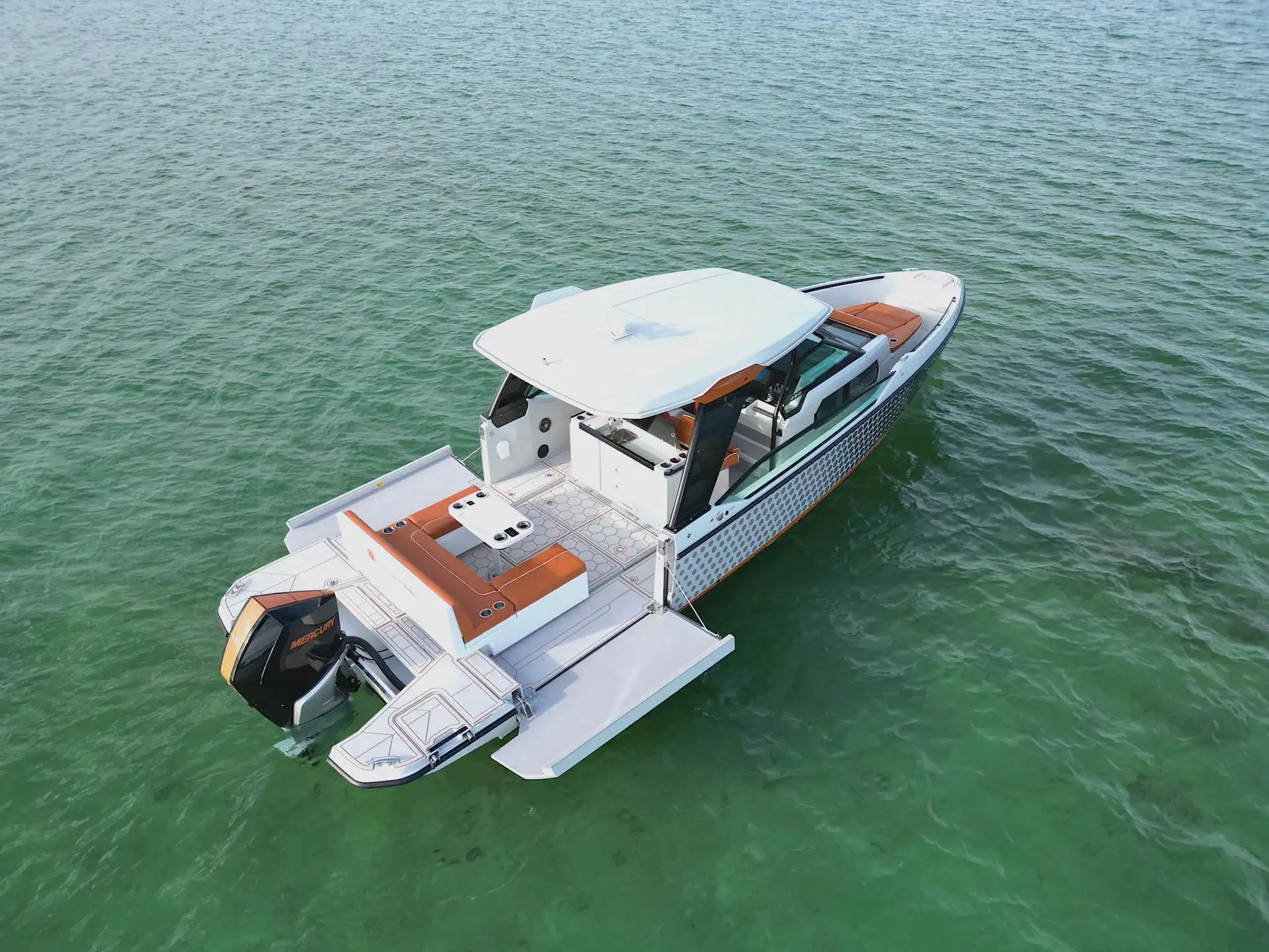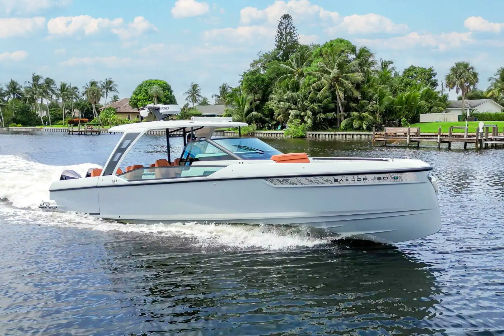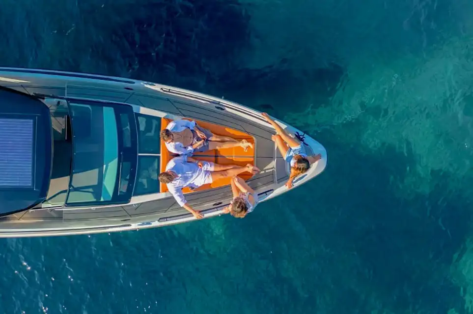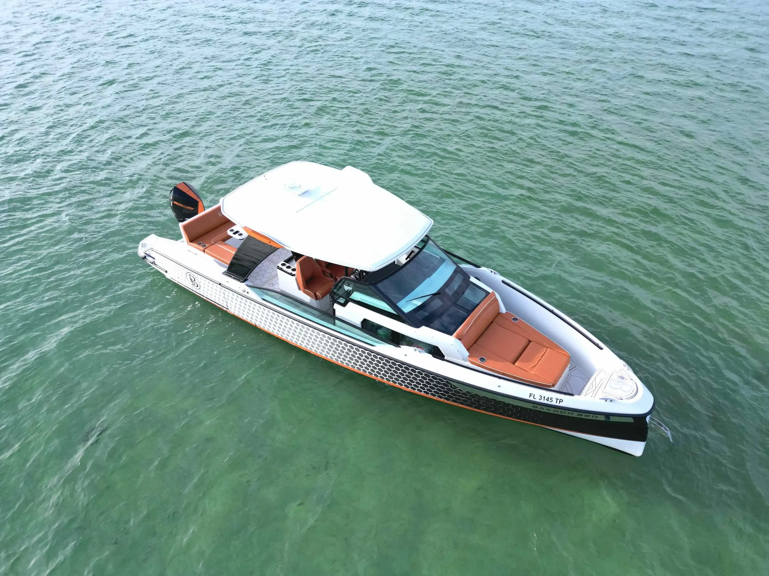El Saxdor de 32 pies destaca por su diseño moderno, líneas elegantes y una distribución pensada para socializar. Cuenta con una amplia cabina, solárium en proa, asientos integrados, sistema de sonido Bluetooth y cómodo acceso a la plataforma de baño. Todo está diseñado para que los invitados puedan relajarse, disfrutar del entorno y vivir el lujo al aire libre con total facilidad. Una elección favorita para quienes buscan un chárter sofisticado y dinámico en Miami Beach.