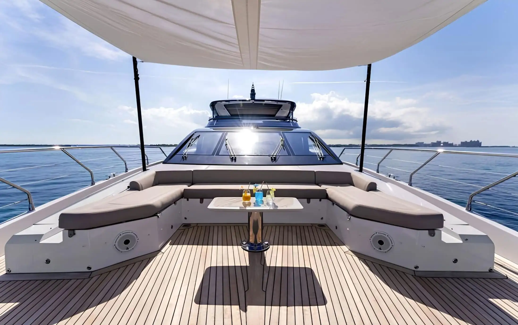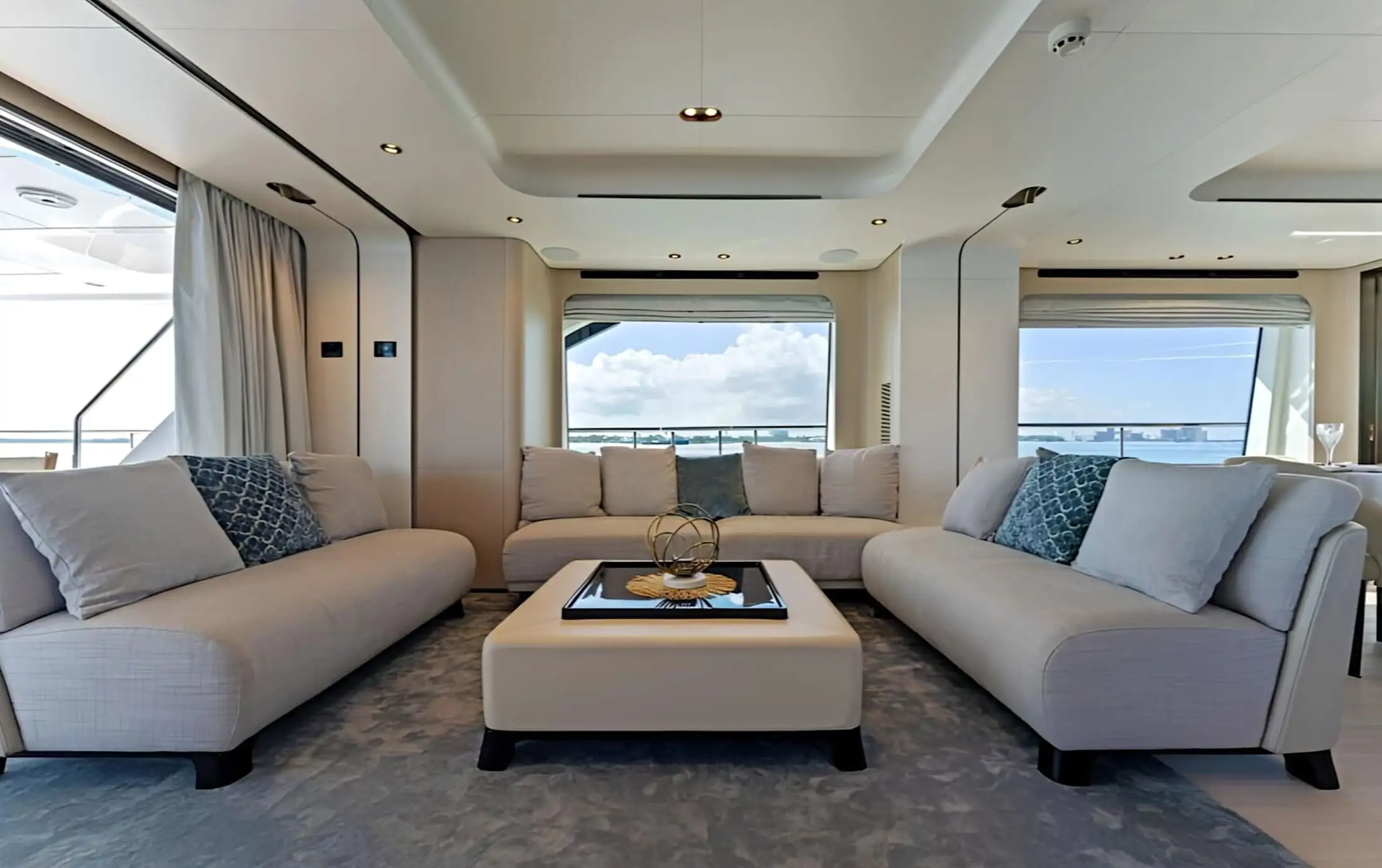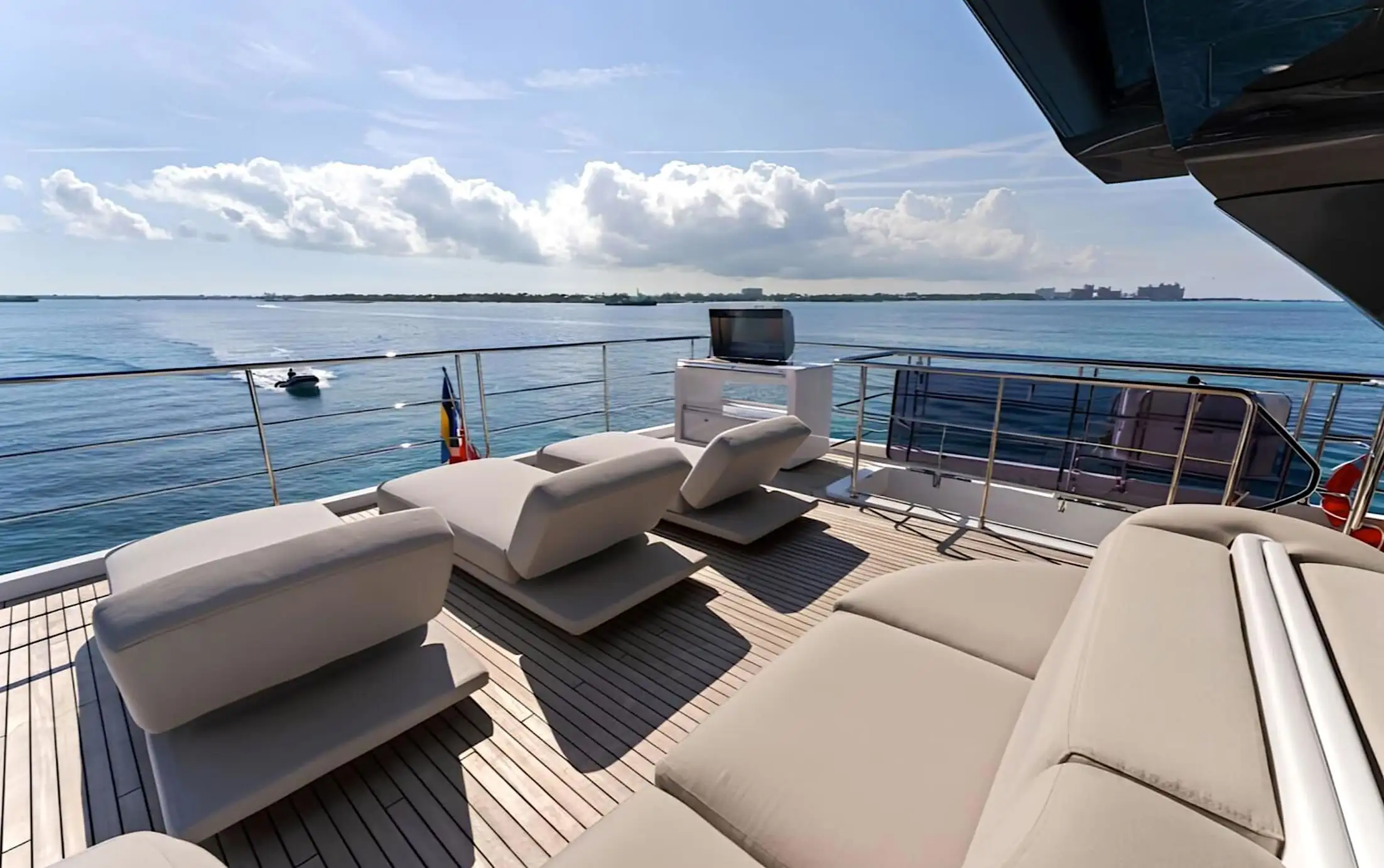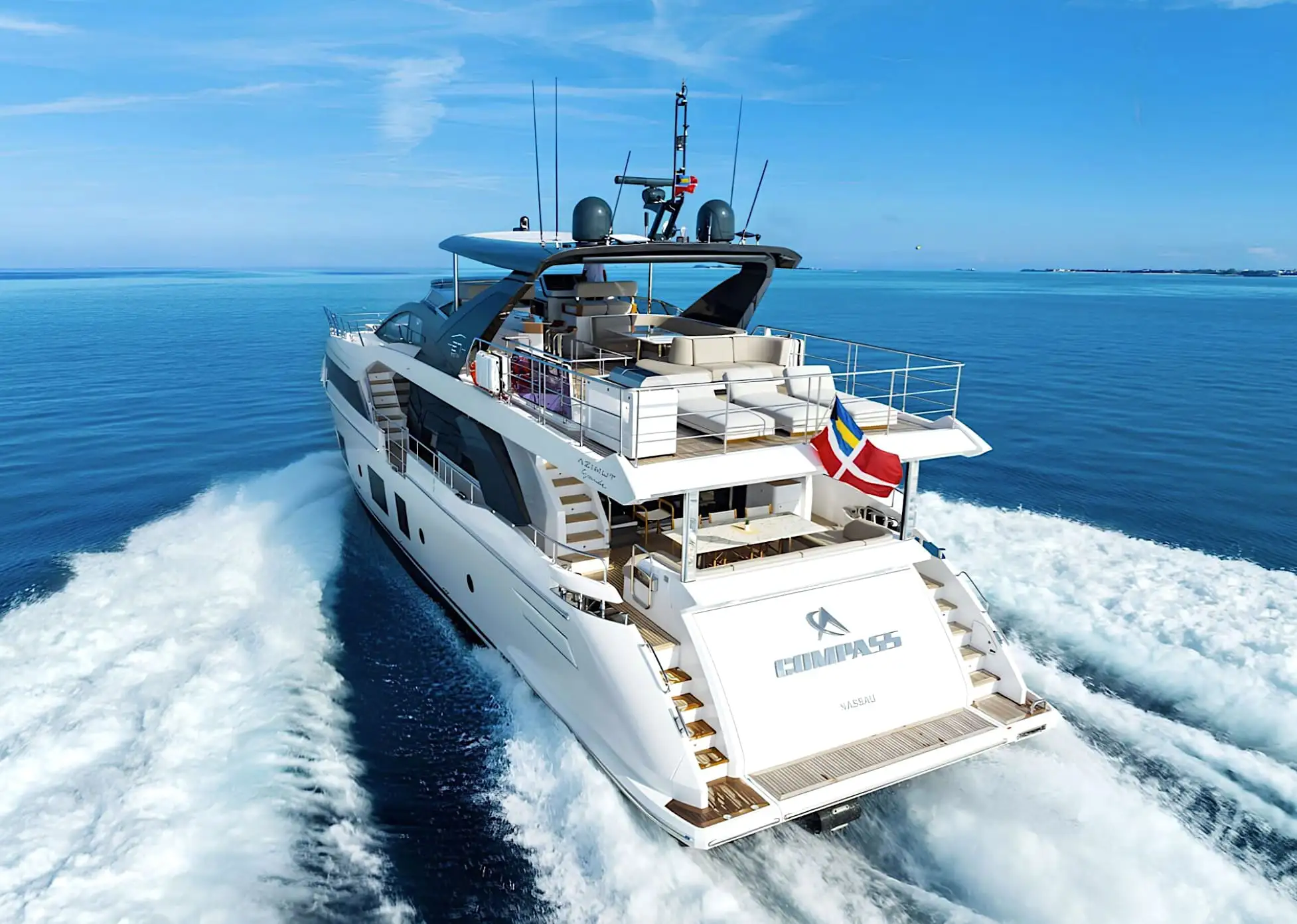 Alquile el Azimut “Compass” de 88 pies, actualmente ubicado en Yacht Haven Grande, Miami, uno de los puertos más prestigiosos para alquiler de yates de lujo en Florida. Procedente de las Bahamas, Compass destaca por su presencia imponente y su diseño elegante. Con una velocidad de crucero de 24 nudos y una máxima de 28 nudos, ofrece un equilibrio perfecto entre alto rendimiento y sofisticación, respaldado por tecnología de navegación de última generación que eleva cada travesía en mar abierto.